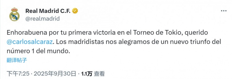 皇马官方社媒写谈:“亲爱的阿尔卡拉斯,祝福你初度获得ATP东京站冠军,皇马球迷为全国第一的又一次夺冠感到风景。”