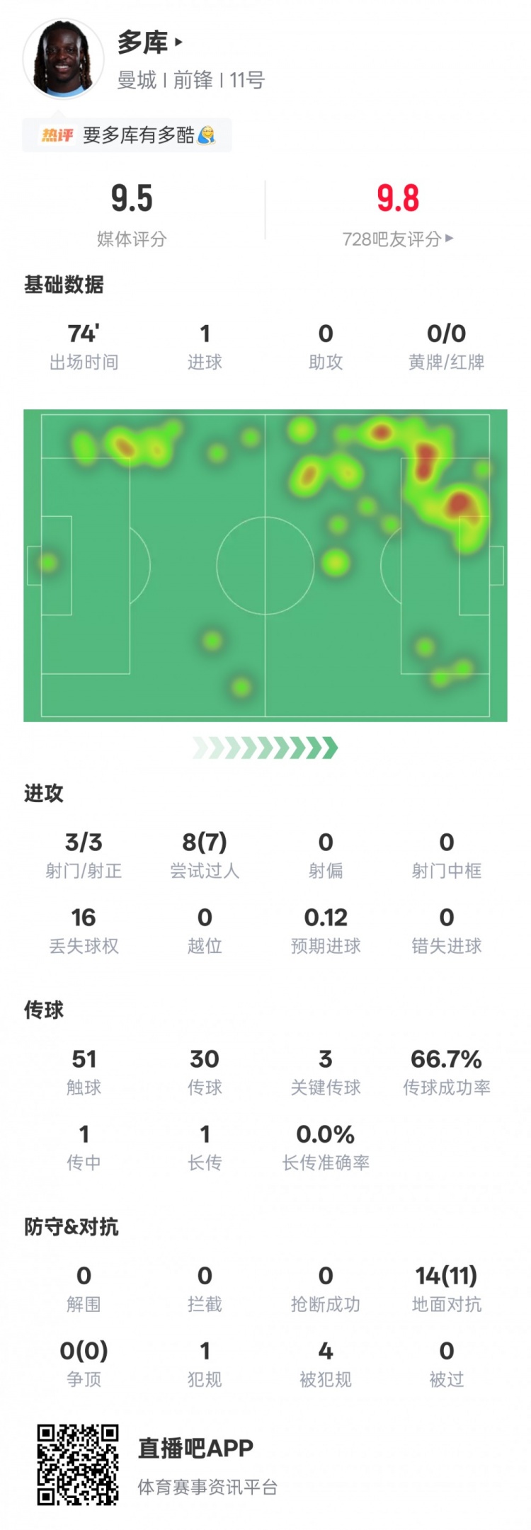 11月10日讯 英超第11轮焦点战,曼城主场迎战利物浦。多库首发登场,孝顺1粒进球,8次过东谈主7次得胜,送出3次短处传球,评分9.5。