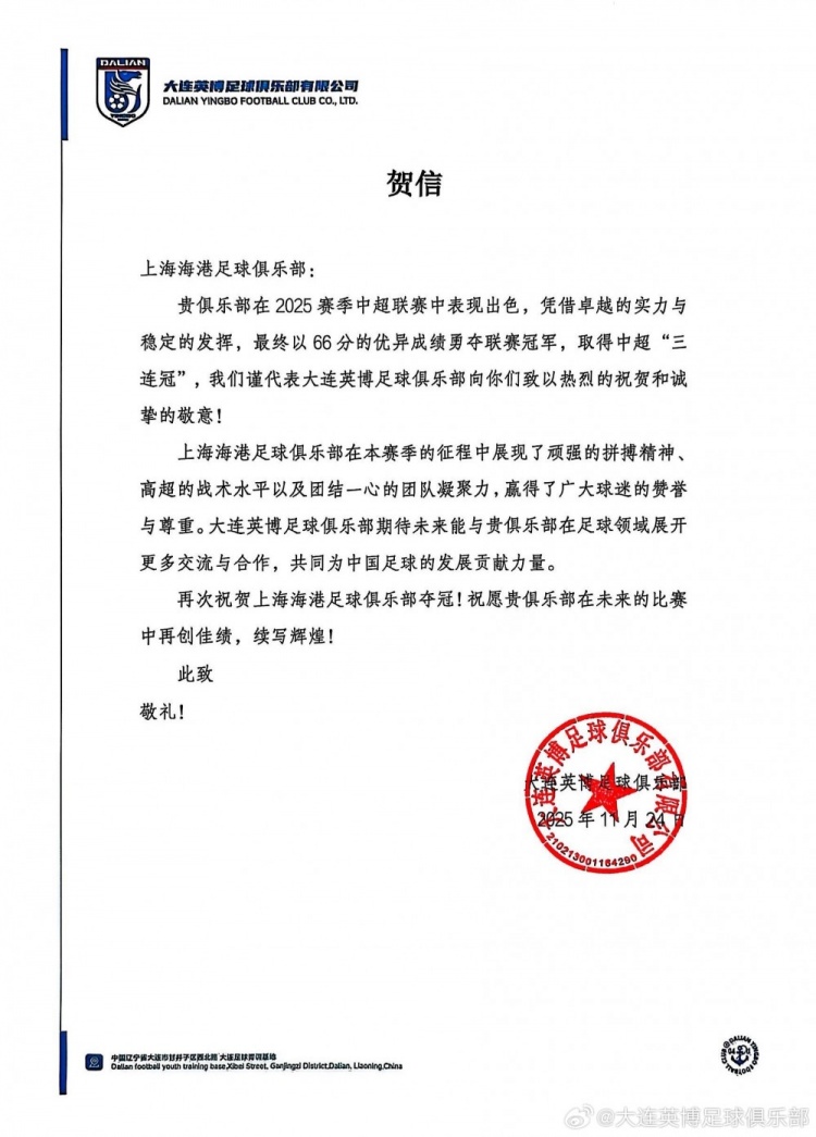 本日大连英博官方发布贺信,祝颂上海海港夺冠,贺信写谈:
