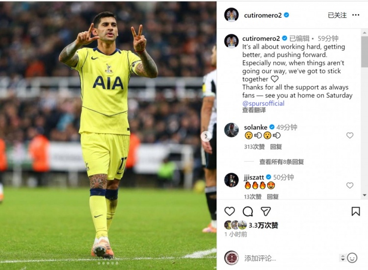 罗梅罗社媒晒出比赛像片,配文:“一切齐关乎接力拼搏、陆续逾越、前赴后继。尤其在当下,当事态不如意时,咱们更要合作一心🤍”