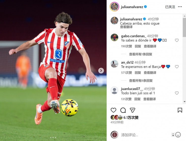 此役阿尔瓦雷斯为马竞踢满全场,但唯一1次射门,赛后他在酬酢媒体上晒出比赛像片,配文:“抬起始来,交往接续。”