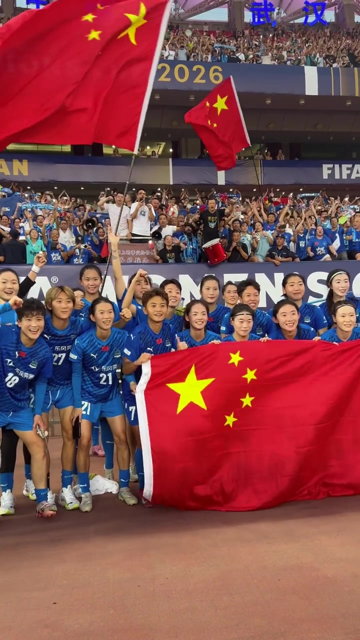 赛后,武汉车谷江大女足展示国旗拍摄大合照。