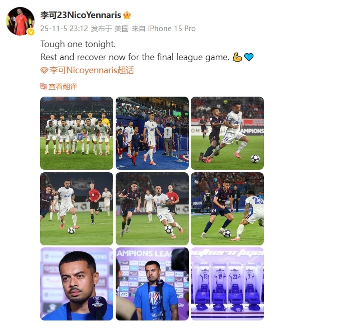 11月5日讯 亚冠精英联赛第4轮,上海申花客场1-3不敌柔佛新山。赛后,上海申花球员李可在社媒共享比赛相片。
