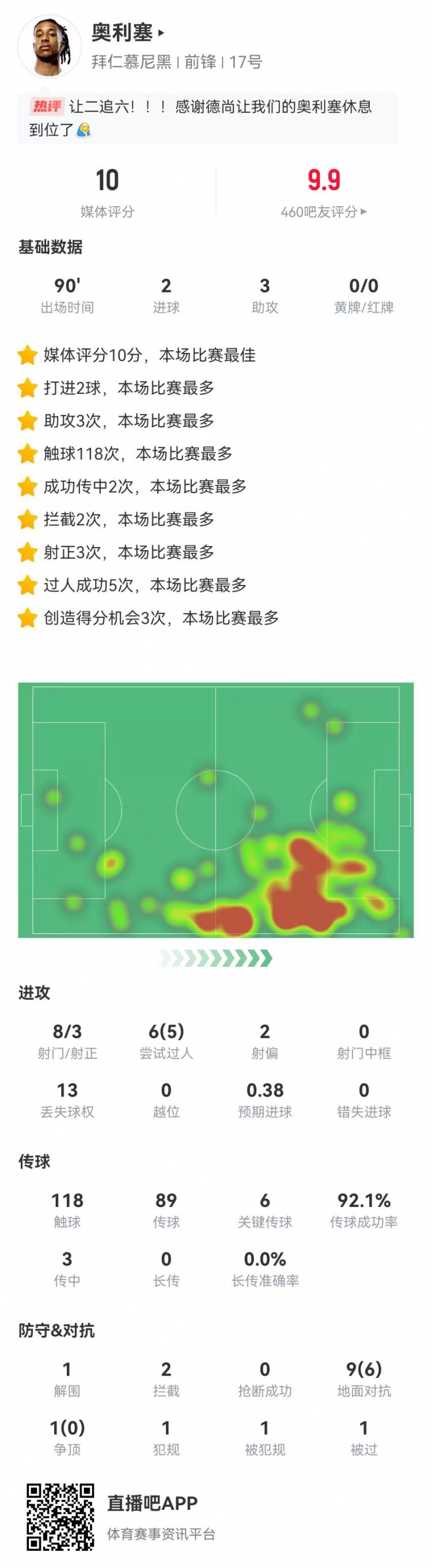 11月23日讯 拜仁在本轮德甲焦点战主场6-2逆转弗赖堡,奥利塞本场数据如下: