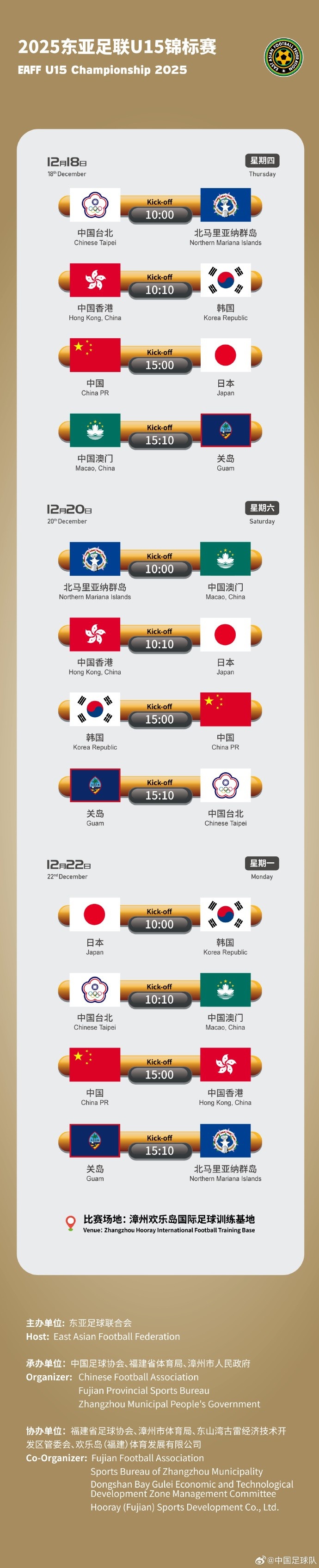 经赛区彩选及东亚足联查验,中国足协现阐述漳州市为2025东亚足联U15锦标赛经办城市。