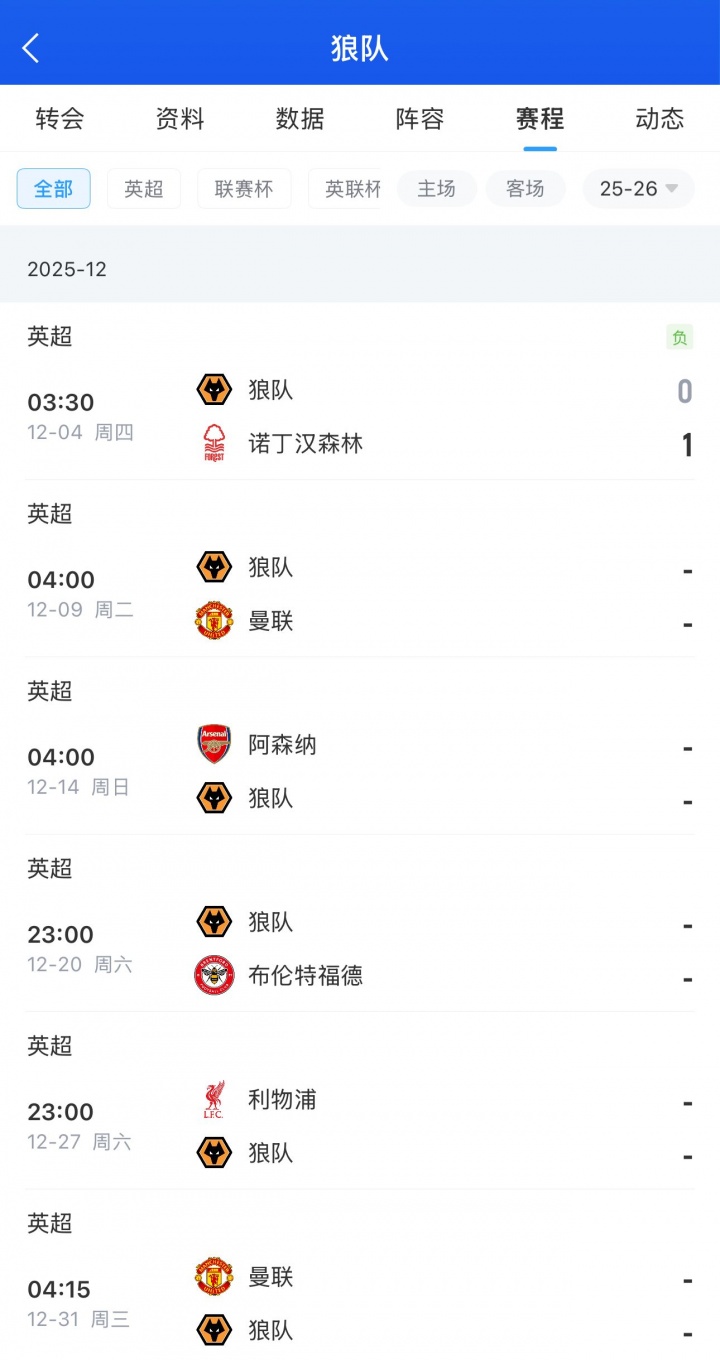 12月英超,狼队还将先后对阵曼联(主)、阿森纳(客)、布伦特福德(主)、利物浦(客)和曼联(客)。