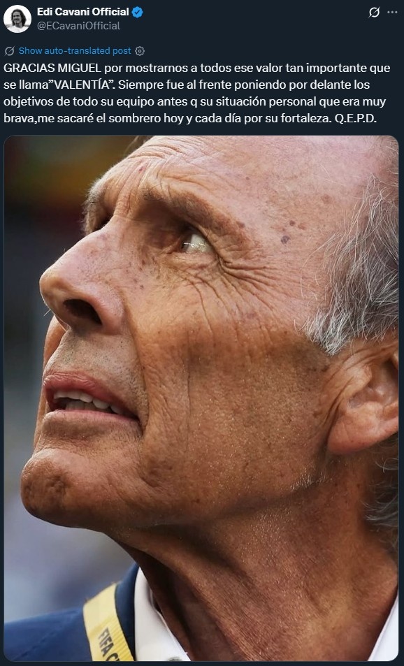卡瓦尼写谈:“感谢你米格尔,你向咱们通盘东谈主展示了名为‘勇气’的珍视品性。你老是冲锋在前,将全队的筹划置于个东谈主逆境之上,尽管你持重验着无比重荷的技巧。今天乃至将来的每一天,我齐将为你展现的力量脱帽致意,愿你安息。”