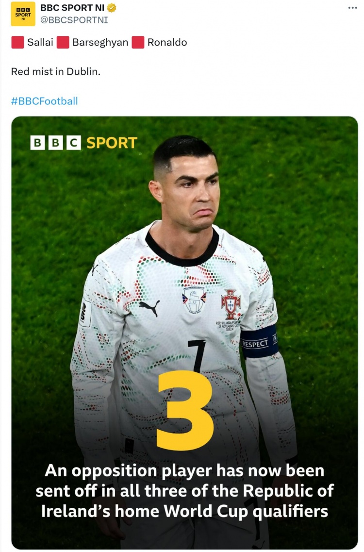 当今在这个小组,葡萄牙积10分陆续领跑,爱尔兰积7分列第三。在爱尔兰此前两场本届世初赛的主场比赛中,匈牙利队和亚好意思尼亚队也各有别称球员拿到红牌,具体情况是: