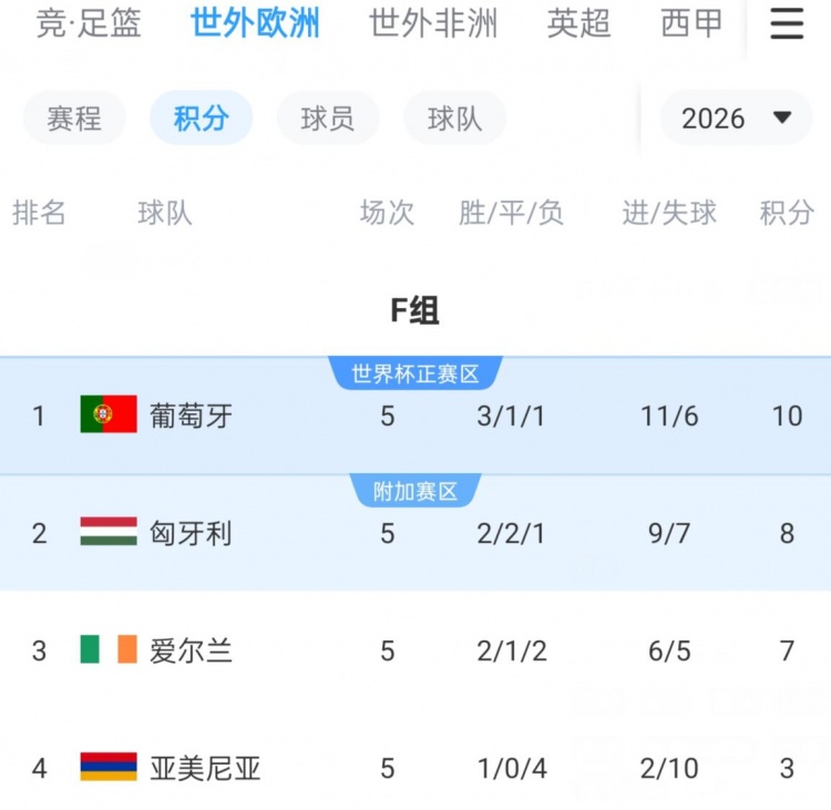 世初赛欧洲区小组赛F组当今的积分款式如下: