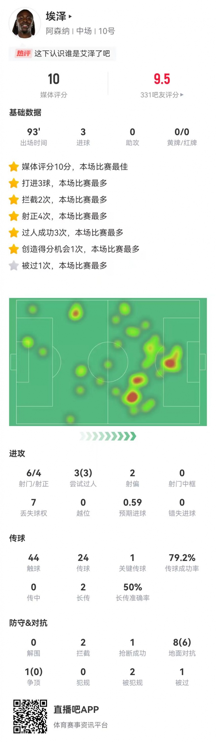11月24日讯 阿森纳在本轮英超4-1大捷热刺,埃泽在本场数据如下: