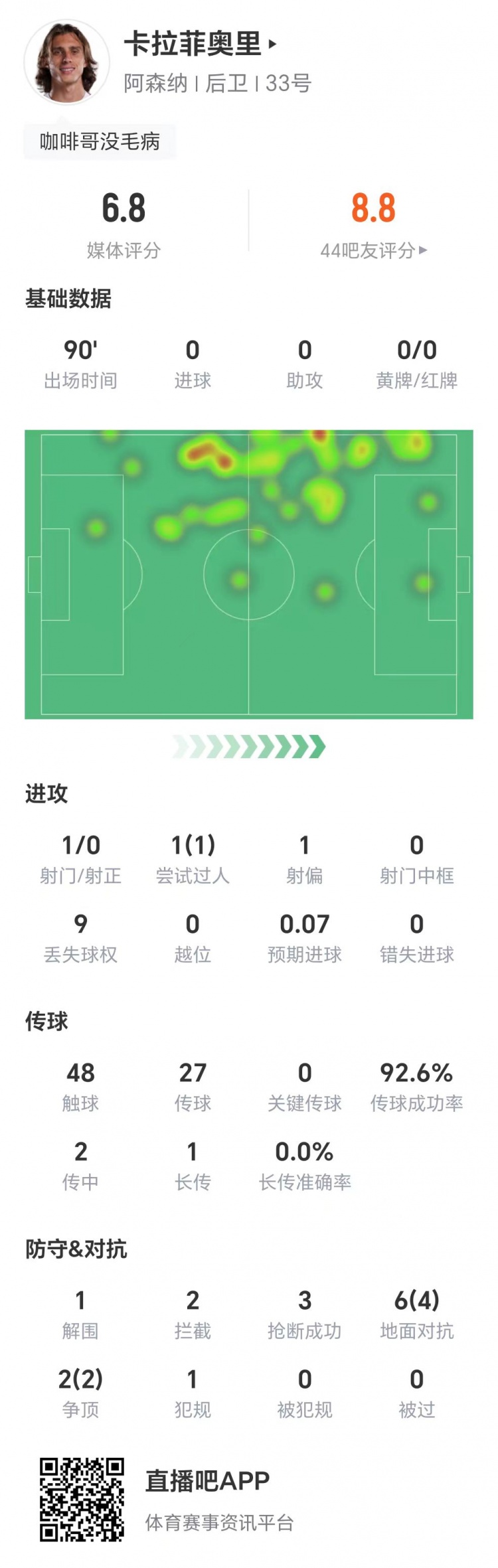 赛后时间统计数据涌现,卡拉菲奥里1射零正,传球见遵循92.6%,1次突围,两次阻碍,3次抢断,6次大地抗争见效4次,两次争顶一王人见效,获评6.8分。