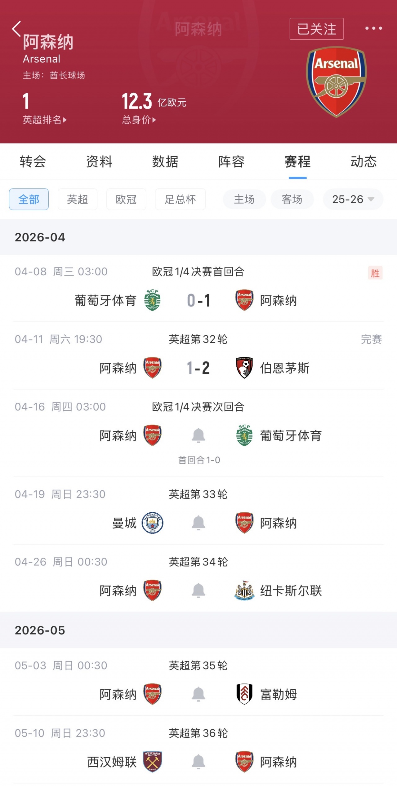 04月11日讯 阿森纳1-2不敌伯恩茅斯,在多赛2场的情况下领跑 曼城9分!