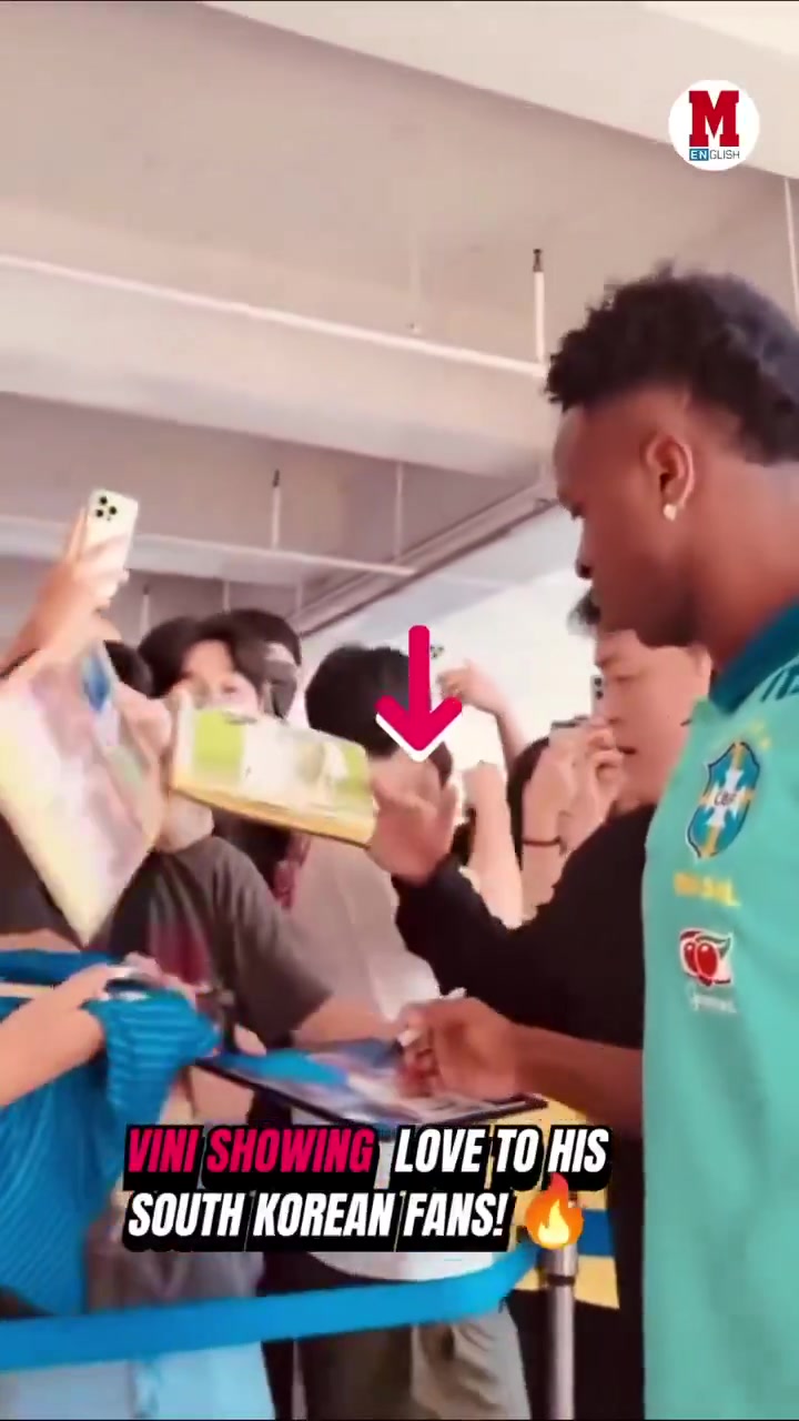 此役在首尔寰宇杯畅通场进行,维尼修斯受到首尔球迷的宽容,他在考验之前为球迷签名。