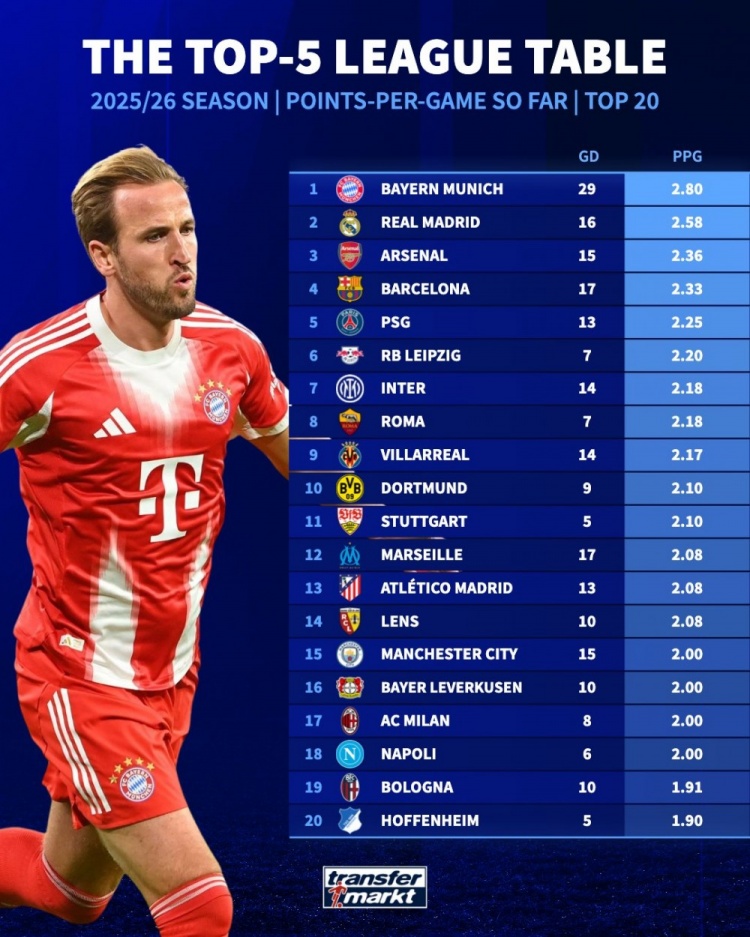 11月21日讯 五大联赛战火行将重燃,《转会商场》也统计了本赛季五大联赛球队场均拿分情况,拜仁独自领跑。