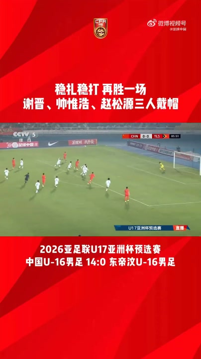 2026亚足联U17亚洲杯预选赛A组第二轮,中国队14比0大捷东帝汶队。