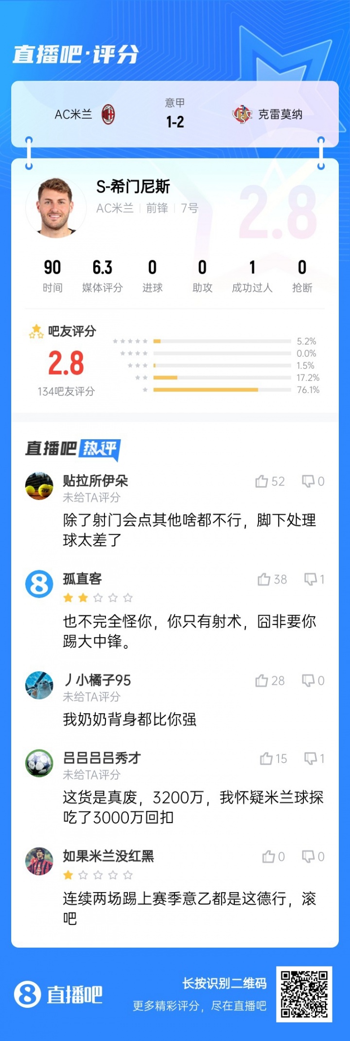 你的位置:阿甲直播 > 意甲 > 3200万引进!希门尼斯回身送球权&致米兰失球,意甲首轮仅2.8分