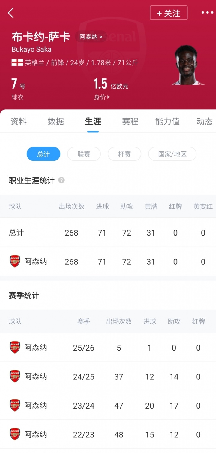 凭据capology的数据,萨卡现时在阿森纳的周薪为19.5万镑,该条约在2023年5月签下。