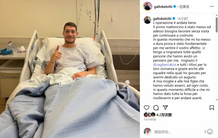 贝洛蒂在酬酢媒体上发布了术后含笑的相片并配文:“手术发达班师。第一块砖还是铺好了,当今咱们要致力继续拓荒。在这个坚苦本事,你们的情愫对我至关热切;我要感谢通盘担心我的东谈主,感谢卡利亚里足球俱乐部及整体球迷的复古,也感谢我着力过的通盘球队给以我的祝颂。”