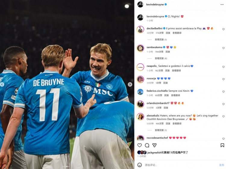 本场比赛德布劳内两度助攻霍伊伦破门,德布劳内在社媒也晒出与霍伊伦的庆祝合影,配文写说念:“欧冠之夜!”