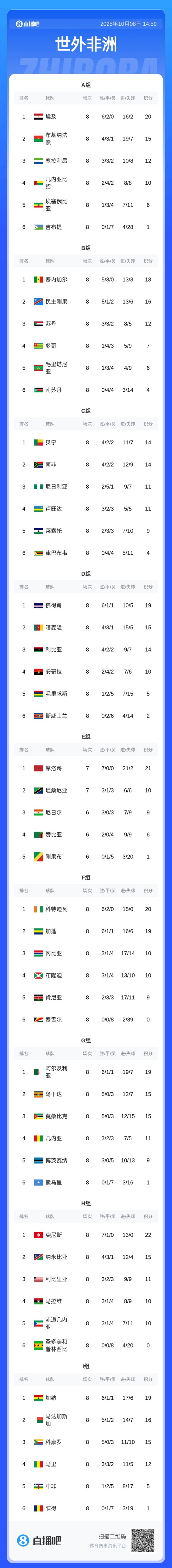 2026好意思加墨宇宙杯,非洲区一共有9个参加宇宙杯限额,外加1个参加跨洲附加赛的限额。摩洛哥、突尼斯上个月已提前晋级。字据出线法规,9个小组第一将径直晋级,收获最佳的4个小组第二晋级下一轮附加赛,决出一席跨洲附加赛限额。