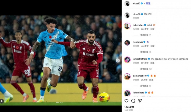 奥赖利也通过社媒晒出我方对位萨拉赫的比赛照,并配文“硬!”抒发我方的郁勃之情。
