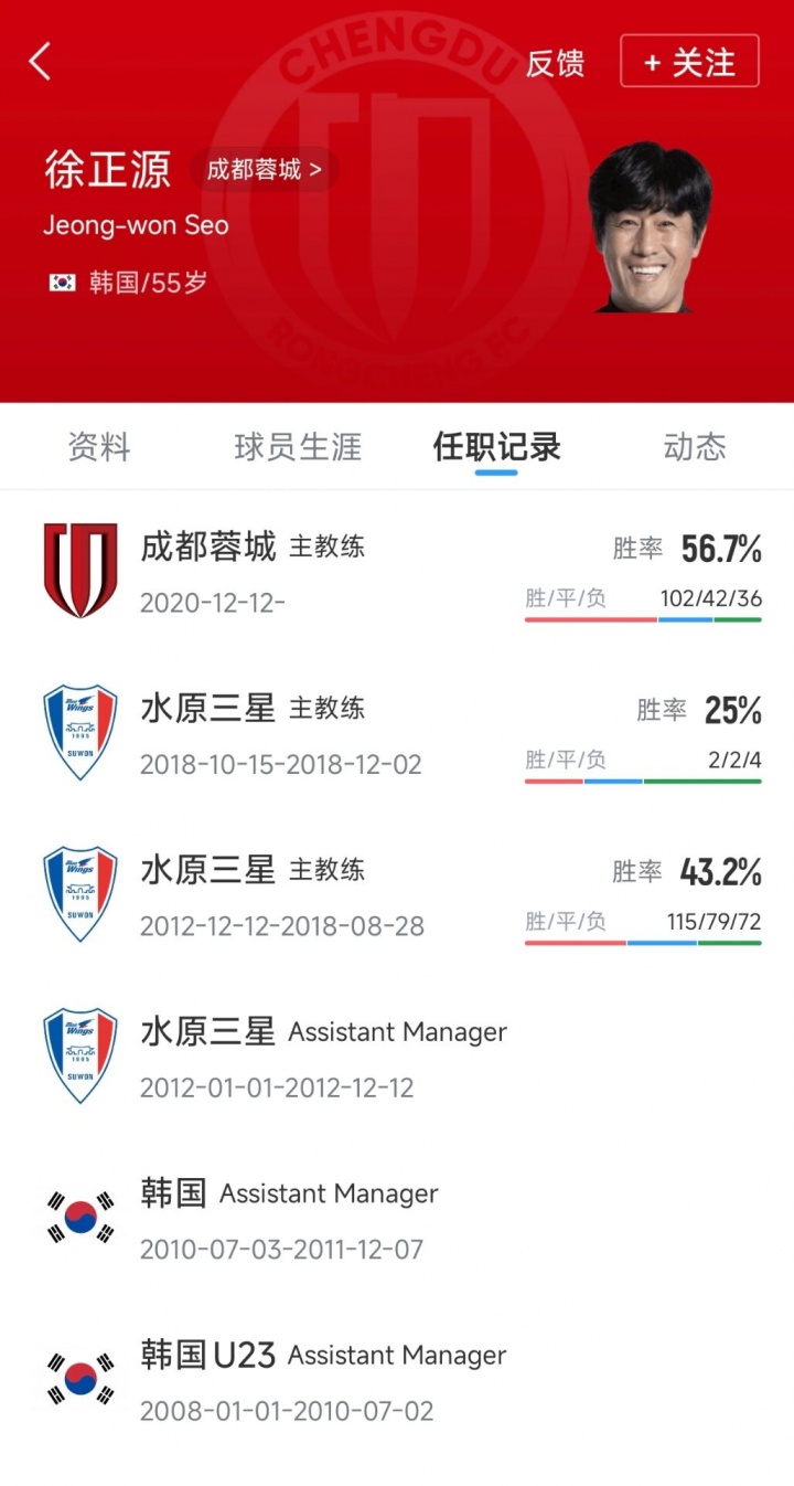 徐正源现年55岁,2020年底运转担任成齐蓉城主帅。本赛季中超29轮事后,成齐蓉城战绩为17胜8平4负,排在第三。