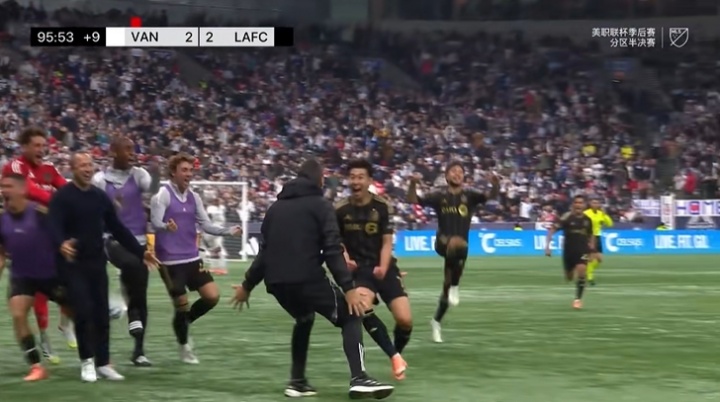 比赛下半场伤停补时第5分钟,孙兴慜淘气球平直破门,洛杉矶2-2绝平温哥华。