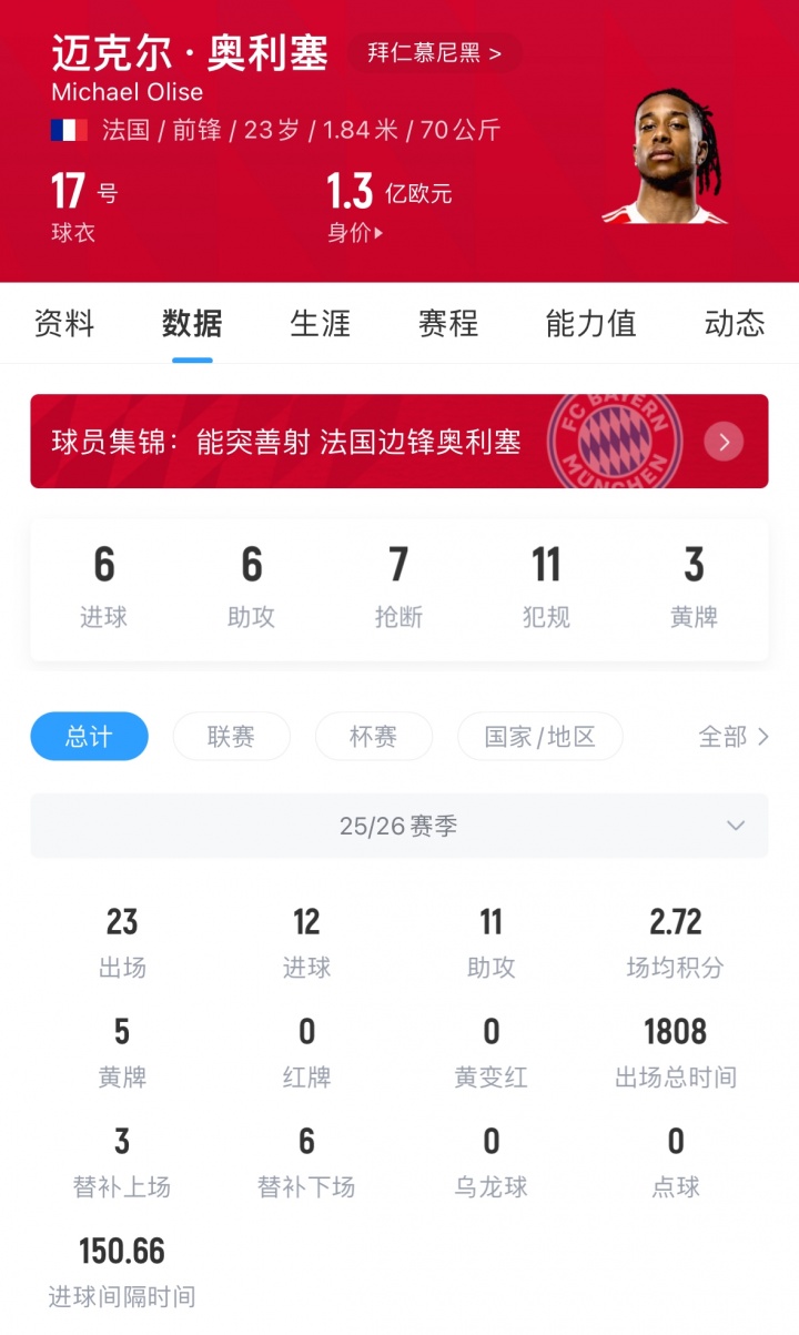 奥利塞现年23岁,司职右边锋,他本赛季为拜仁出战23次,孝敬12球11助,他与拜仁的协议在2029年到期,现身价1.3亿欧。据悉,奥利塞与拜仁莫得解约金条件。